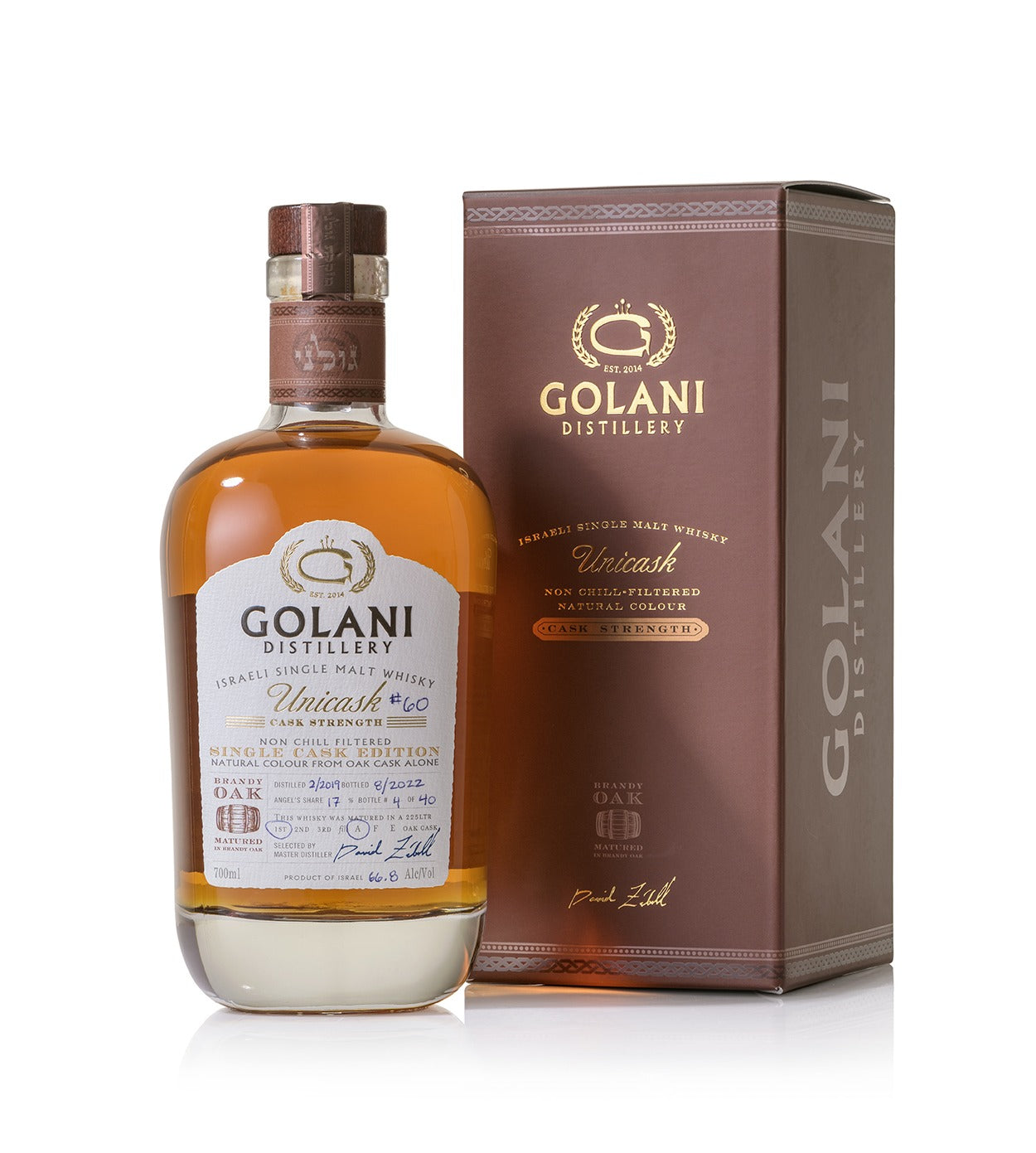 Golani Unicask Single Malt Brandy Oak. Mashed from Pilsner, Chocolate Malt and a touch of peated malt and fully matured in a 1st fill cask that previously held Israeli apple brandy. Bottled at natural cask strength of 62.8%. 700ml.